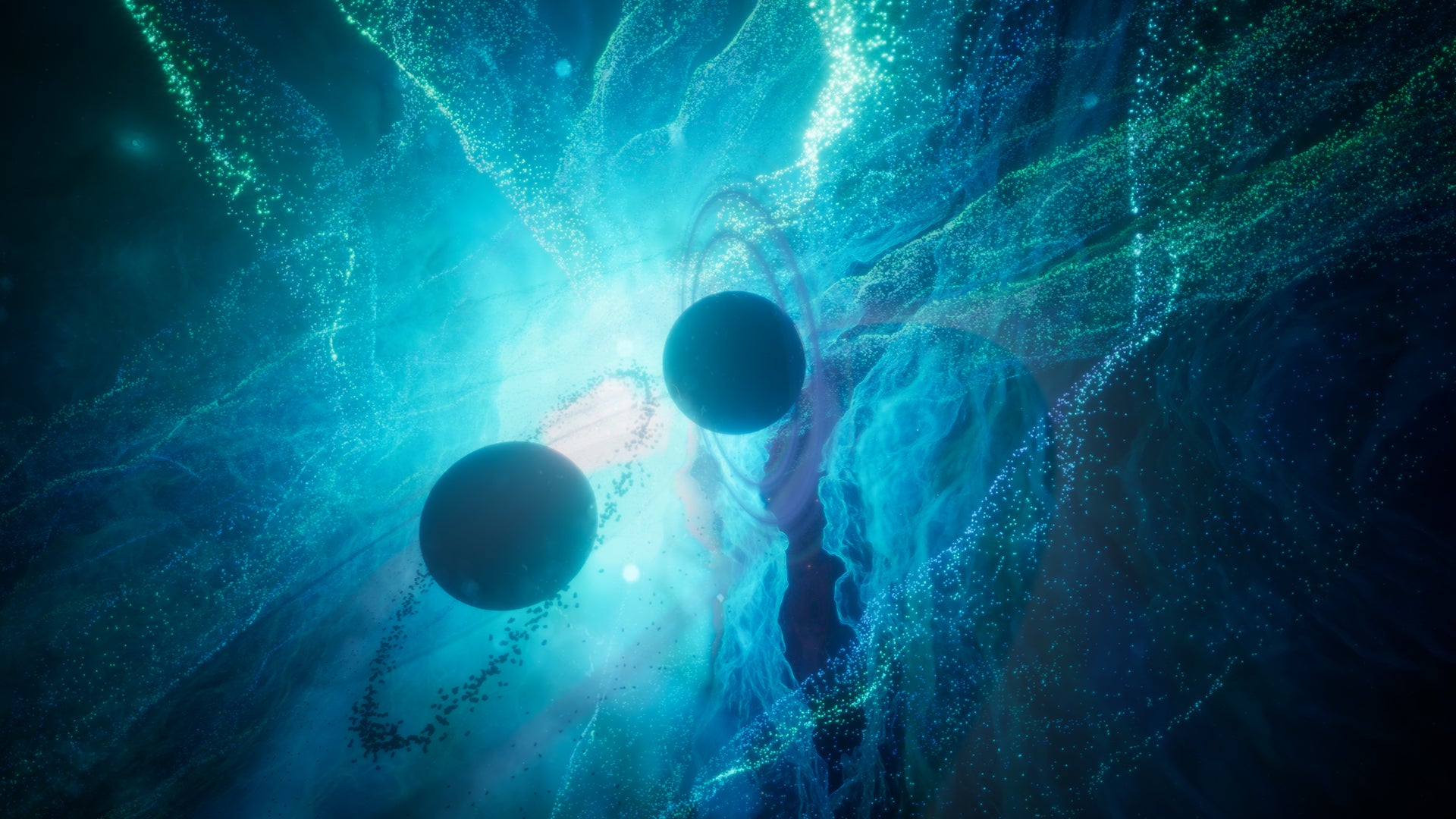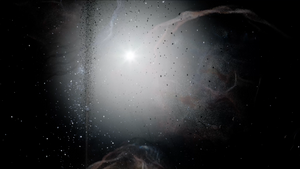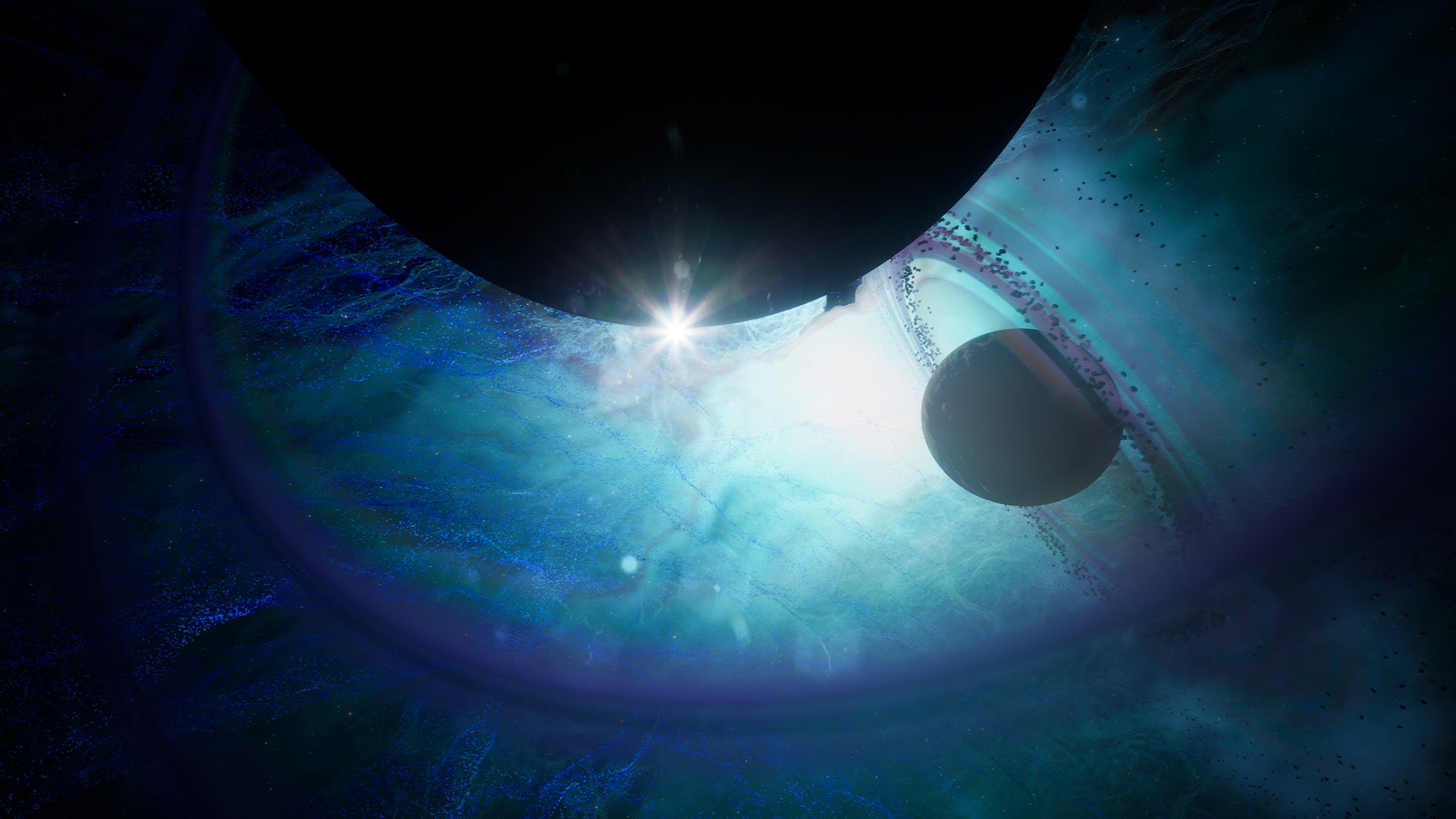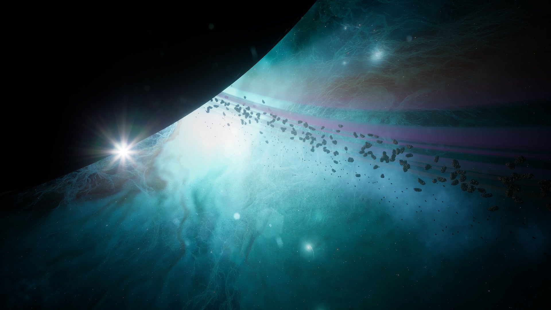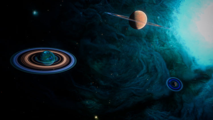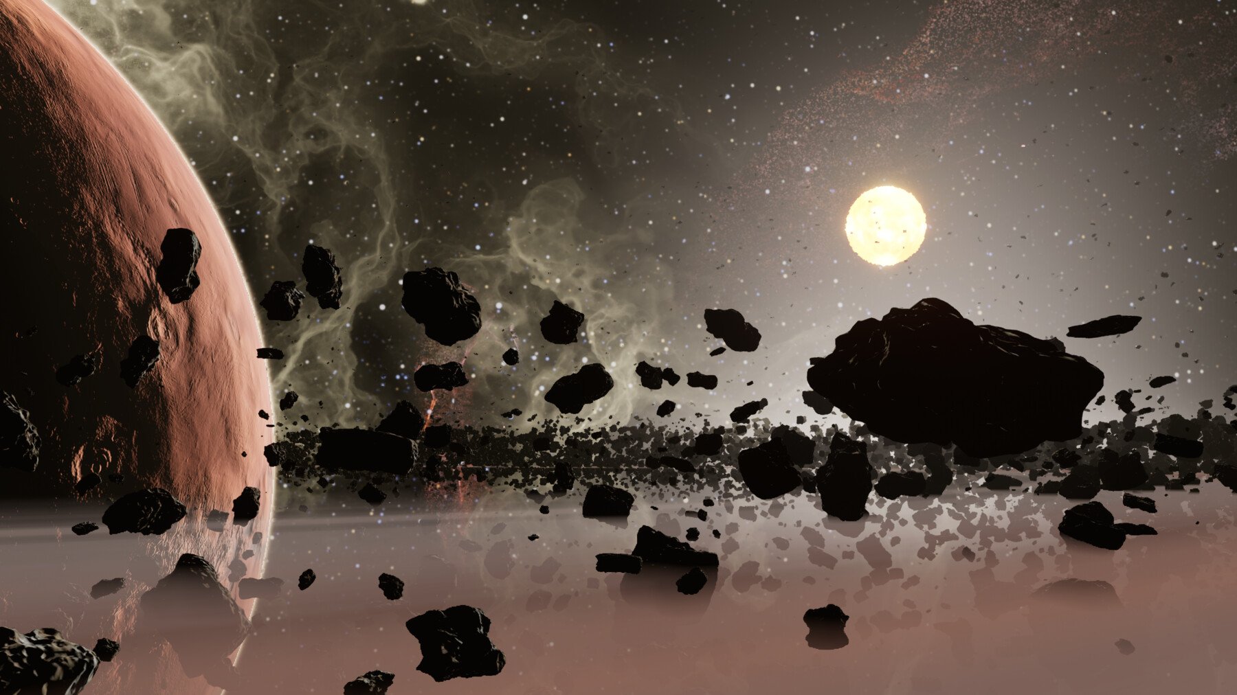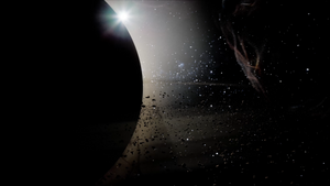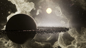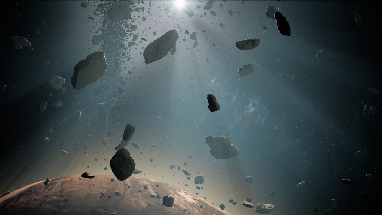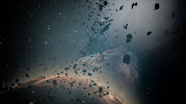 Asteroids that float and rotate around the Planet based on a Niagara Velocity System that follows the shape of the Gas Vortex